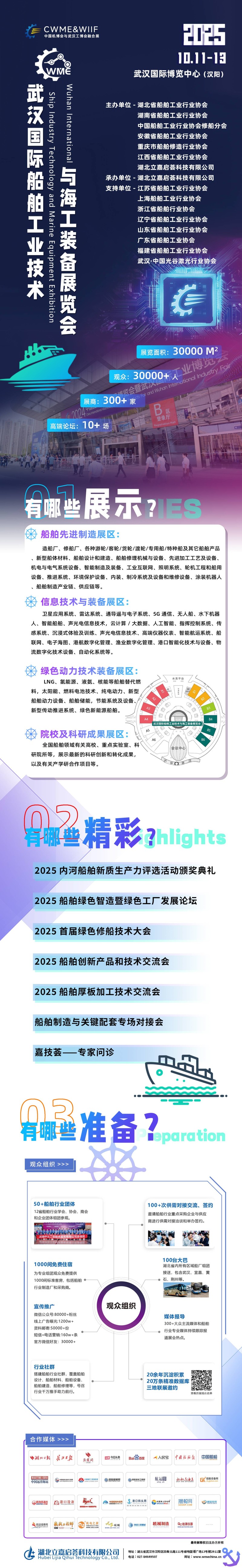武汉国际船舶工业技术与海工装备展览会(同期举办第25届中国机博会暨武汉工博会) 将于2025年10月11-13日在武汉国际博览中心(汉阳)举办,本届展会以“新质势能、智链全球”为主题,充分发挥内河流域新质生产力的产业优势,搭建“会展+产业+投资贸易”的会产贸平台。