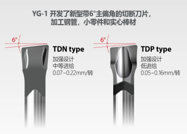 YG-1新型双面6°主偏角切断刀片是加工钢,不锈钢和铸铁的最佳选择。这种带有新角度切断刀片减少了切削力,通过去除毛刺和成品部件上的飞边,提高工件完成质量。