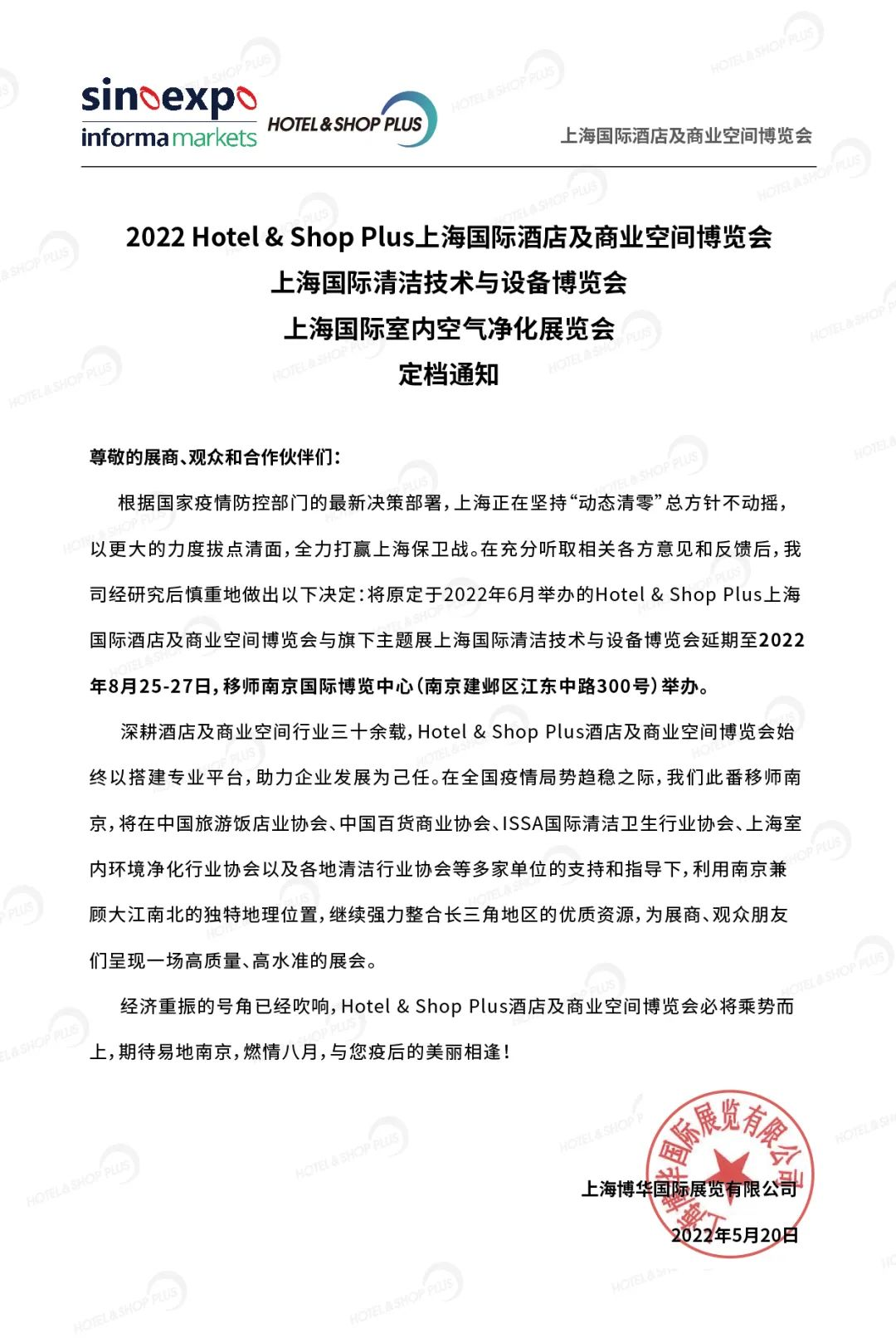 根据国家疫情防控部门的最新决策部署,上海正在坚持“动态清零”总方针不动摇,以更大的力度拔点清面,全力打赢上海保卫战。在充分听取相关各方意见和反馈后,我司经研究后慎重地做出以下决定:将原定于2022年6月举办的Hotel & Shop Plus上海国际酒店及商业空间博览会与旗下主题展上海国际清洁技术与设备博览会延期至2022年8月25-27日,移师南京国际博览中心(南京建邺区江东中路300号)举办。