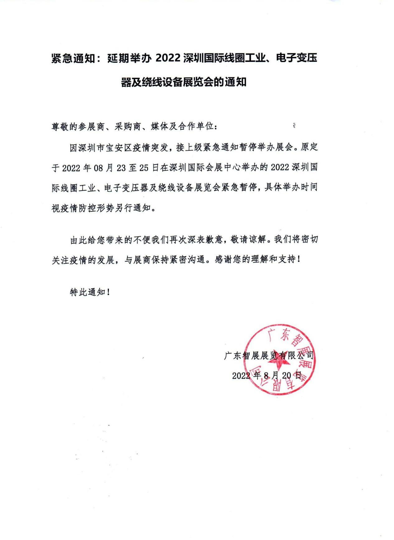 因深圳市宝安区疫情突发,接上级紧急通知暂停举办展会。原定于2022年08月23至25日在深圳国际会展中心举办的2022深圳国际线圈工业、电子变压器及绕线设备展览会紧急暂停,具体举办时间视疫情防控形势另行通知。